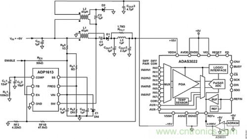 ADP1613用作單端初級(jí)原邊電感(SEPIC) Cuk轉(zhuǎn)換器,是ADAS3022在外部5 V電源供電情況下,為其提供20 mA時(shí)所需±15 V高壓電源以及最大值為3 mV的低輸出紋波的理想選擇。本應(yīng)用中,ADP1613的開關(guān)頻率為1.3MHz。如圖3所示,ADP1613盡可能地減少了外部元器件數(shù)目,并且具有超過(guò)86%的效率,因此它能滿足ADAS3022的規(guī)格要求。在該拓?fù)渲惺褂玫统杀続DP1613的最大優(yōu)勢(shì),是它在兩條供電軌之間的出色跟蹤能力,同時(shí)使用現(xiàn)成的耦合電感可產(chǎn)生±15 V電壓。除此之外,還能通過(guò)ADIsimPower設(shè)計(jì)工具輕松快捷地完成設(shè)計(jì)制造。