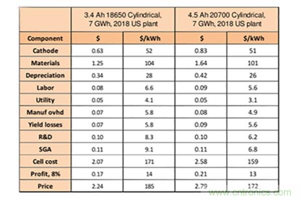 Tesla公開說(shuō)明選擇20700的優(yōu)勢(shì):“If the new meets the same life and safety requirements, once it is produced at the same yields and at high volume, it will offer about 3-4 % increase in energy density and a 7 % reduction in cost”,即在達(dá)到與18650同樣的良率和產(chǎn)能后,能帶來(lái)能量密度增加和成本下降兩個(gè)優(yōu)勢(shì),這從下表中也能得到充分體現(xiàn)。