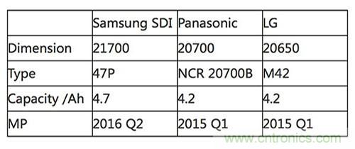 在此前后,Samsung公開開發(fā)21700,LG生產(chǎn)20650型號(hào)(見下表)。