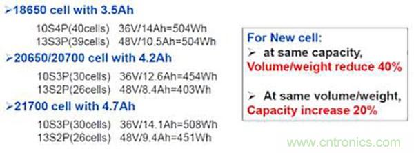 采用20700 /21700 /20650后,由于同等能量下,電池?cái)?shù)量減少(以21700為例,減少1 /3),這會(huì)帶來(lái)整個(gè)Pack內(nèi)部金屬連接件數(shù)量的減少,這會(huì)進(jìn)一步降低電池Pack的質(zhì)量。