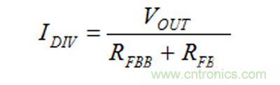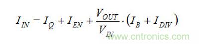 由于這個方程式?jīng)]有將轉(zhuǎn)換器中的損耗算在內(nèi),所以它給出的是一個最佳情況下的估算值。第一個被稱為IQ的數(shù)據(jù)是我在上一部分中談到的非開關(guān)式靜態(tài)電流。下一個數(shù)據(jù)項,IEN 是進(jìn)入穩(wěn)壓器使能輸入的電流。很多轉(zhuǎn)換器需要一定大小的偏置電流流入使能輸入。如果使能引腳被連接至輸入電源,以接通穩(wěn)壓器的話,那么你必須將這個電流考慮在內(nèi);否則的話,這個值為零。數(shù)據(jù)項IDIV 是反饋分頻器內(nèi)的電流,使用方程式2,可以很容易地計算出這個值:
