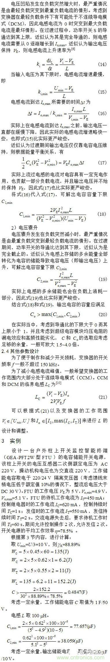 根據(jù)能量平衡關(guān)系,分析了負(fù)載突然增大和負(fù)載突然減輕情況下的最嚴(yán)重電壓凹陷和電壓驟升,并得出輸出濾波電容容量的設(shè)計(jì)考慮。以一個(gè)具體的電容儲(chǔ)能FTU電源為例,詳細(xì)說(shuō)明了電路參數(shù)的設(shè)計(jì)方法,并進(jìn)行了實(shí)驗(yàn)研究。實(shí)驗(yàn)結(jié)果表明所設(shè)計(jì)的電容儲(chǔ)能備用電源能夠滿足在失去正常供電電源后自動(dòng)化終端待機(jī)、操作和通信的需要,并且所進(jìn)行的理論分析與實(shí)際情況相符。