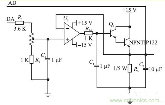 恒流源電路原理結(jié)構(gòu)圖如圖2 所示,由于D/ A轉(zhuǎn)換輸出的模擬信號不穩(wěn)定,加上C3 穩(wěn)定電壓。經(jīng)過3.6 K 的電阻和1 K 的電位器加到單運放OP07 的同相輸入端,調(diào)節(jié)電位器的阻值的大小可調(diào)節(jié)同相輸入端的電位,從而改變輸出點的電位,輸出電位加到達(dá)林頓管的B 管腳上,進(jìn)入達(dá)林頓信號產(chǎn)生自激信號,通過C1過濾掉。利用達(dá)林頓管的電流放大特性,可實現(xiàn)大電流的輸出,電流放大倍數(shù)為1 000 ~15 000倍。