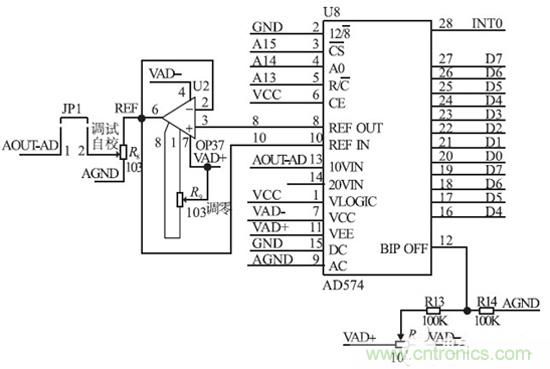 A/ D 采樣輸入電路如圖4 所示。為了滿足取樣精度需要,我們選擇12 bit A/ D 轉(zhuǎn)換器和12 bitD/ A 轉(zhuǎn)換器,使步進(jìn)小于1 mA,在電路中A/ D 啟動后,先讀高8 位結(jié)果,再讀后4 bit;D/ A 是先寫入高8 bit,再寫入低4 bit.