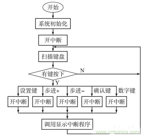采用數(shù)字控制策略比模擬控制的有無可比擬的優(yōu)勢:實現(xiàn)不同的控制算法;數(shù)字PID 具有設(shè)計周期短,調(diào)試和升級方便。數(shù)字控制系統(tǒng)主程序圖如圖6 所示。在系統(tǒng)加電后,主程序首先完成系統(tǒng)初始化,其中包括A/ D、D/ A、串行口、中斷、定時/ 計數(shù)器等工作狀態(tài)的設(shè)定,給系統(tǒng)變量賦初值,顯示上次設(shè)定值等。然后掃描獲取鍵值,判斷設(shè)定鍵、校準(zhǔn)鍵是否按下,執(zhí)行相應(yīng)的功能子程序。當(dāng)啟動鍵按下后,根據(jù)設(shè)定值、校正等參數(shù)計算對應(yīng)輸出的數(shù)字量,再進(jìn)行閉環(huán)反饋調(diào)整,如圖6 所示。