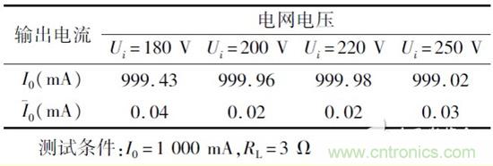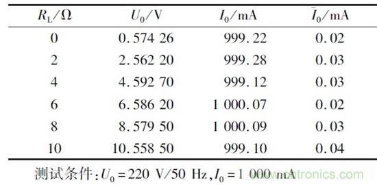 負(fù)載穩(wěn)定性測試條件為U0 =220 V/50 Hz,I0 =1000 mA,測試數(shù)據(jù)如表2 所示,其中負(fù)載穩(wěn)定度是指一定的工作情況下,負(fù)載變化引起的輸出電流變化。測試數(shù)據(jù)表明負(fù)載在0 ~10 贅變化時,輸出電流最大偏差為0. 99 mA,紋波電流小于0. 05 mA.