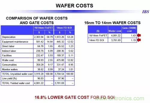 晶體管成本,根據(jù)他的計算,14納米FD-SOI工藝單位晶體管成本比相應(yīng)的FinFET工藝低了近17%。