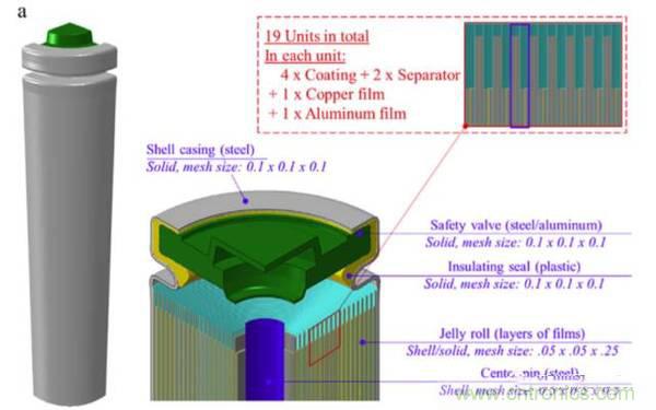 由于在動力電池組中18650電池一般是采用垂直裝配的,在電池組發(fā)生跌落等情況下,軸向擠壓是造成鋰離子電池變形的主要原因,因此Juner Zhu主要研究了在軸向壓力下電池變形導致鋰離子電池短路的機理。一些傳統(tǒng)的模型由于假設鋰離子電池內部是一個均一的整體,因此在預測18650電池軸向壓縮試驗的時候就無法準確預測試驗結果,這主要是由于鋰離子電池電芯的特殊結構,導致在電芯的上部和下部并不完全一致,同時由于鋰離子電池上蓋(也就是正極)獨特的結構使得鋰離子電池在承受軸向壓力的時候,可能會在內短路發(fā)生之前,就引起鋰離子電池發(fā)生短路。