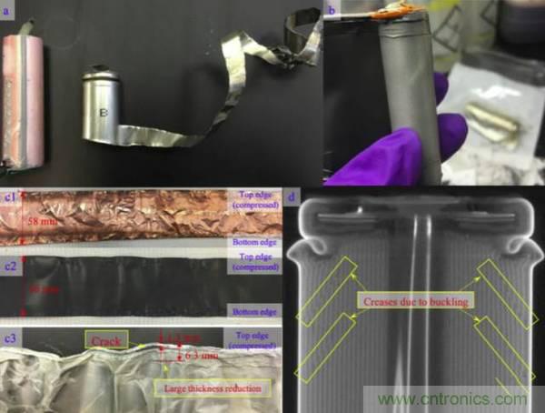對試驗后的18650電池進行拆解顯示,雖然電芯發(fā)生了嚴重的變形,但是正負極并沒有發(fā)生斷裂,反而是隔膜在距離上部邊緣1.3mm的位置出現(xiàn)了一個裂縫,這直接導致了電池發(fā)生短路,電壓突降,而這一裂縫可能是由于金屬箔鋒利的邊緣侵入造成的。此外隔膜的在一些位置厚度出現(xiàn)了很大的下降,這主要是由于凹陷的外殼擠壓電芯造成的。