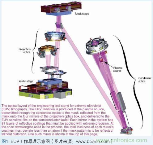 EUV的基本工作原理:激光對(duì)準(zhǔn)氙氣噴嘴。當(dāng)激光擊中氙氣時(shí),會(huì)使氙氣變熱并產(chǎn)生等離子體;一旦產(chǎn)生等離子體,電子便開始逃逸,從而發(fā)出特定波長(zhǎng)的光;接著這種光進(jìn)入聚光器,然后后者將光匯聚并照到掩膜上;通過在反射鏡的一些部分施加而其它部分不施加吸收體,在反射鏡上形成芯片一個(gè)平面的圖案的光學(xué)表示,這樣就產(chǎn)生了掩膜;掩膜上的圖案被反射到四到六個(gè)曲面反射鏡上,從而將圖像微縮,并將圖像聚投到硅晶圓上;每個(gè)反射鏡使光線稍微彎曲以形成晶圓上的圖像,這就像照相機(jī)中的透鏡將光彎曲以在膠片上形成圖像一樣。