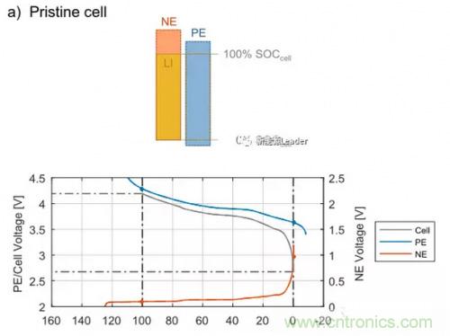 首先Christoph R. Birkl根據(jù)扣式電池極片的面積計(jì)算得到了扣式電池的理論容量,然后通過(guò)對(duì)正極極片進(jìn)行充電脫鋰模擬了不同程度的鋰鋰離子損失,通過(guò)對(duì)負(fù)極極片進(jìn)行裁切模擬了負(fù)極活性物質(zhì)損失,對(duì)正極極片裁切模擬了正極活性物質(zhì)損失。為了對(duì)試驗(yàn)結(jié)果進(jìn)行分析,Christoph R. Birkl利用柱狀圖建立了一個(gè)物理模型,如上圖所示,其中左側(cè)為負(fù)極的SoC狀態(tài),右側(cè)為正極的SoC狀態(tài),上圖模型為正常電池的模型,從圖上可以看到在正常電池設(shè)計(jì)中,一般會(huì)負(fù)極的容量設(shè)計(jì)的稍微高一些,這一般稱(chēng)作正負(fù)極冗余,適當(dāng)?shù)娜哂嗫梢员WC鋰離子電池循環(huán)性能,也能在鋰離子電池發(fā)生過(guò)充的情況下能夠容納足夠的鋰,確保鋰不析出,保證電池的安全性。