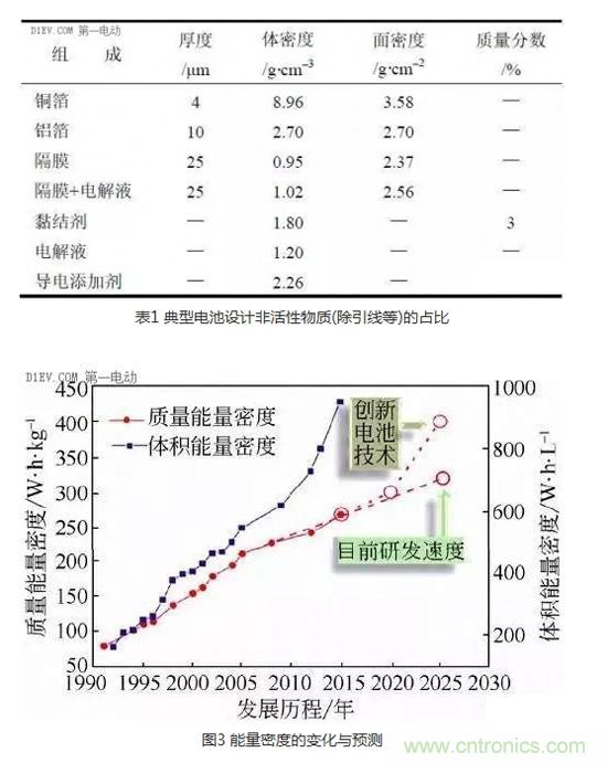 電池的能量密度基本由電池的正負極決定的,但光是正負極活性材料也不能保證電池能發(fā)上電,得有很多非活性物質(zhì),比如導電輔助劑、活性粉末之間的粘結(jié)劑、隔離膜、陰陽極的箔材、絕緣固定的膠紙、外邊鋁塑膜殼子或者鋼鋁殼等等(表1 典型電池設計非活性物質(zhì)的占比)。我們的媒體,總喜歡搞大新聞,有意無意的忽略這部分物質(zhì)的含量,得出的能量密度老能高到天上去,與事實相差較大,誤導無辜吃瓜群眾。其實,這部分相當重要,就拿過去十幾年的技術進步來說,我們電池的能量密度提升主要就是靠著活性物質(zhì)占比的提升來實現(xiàn)的。