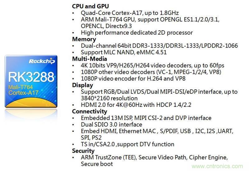接口方面,RK3288具有多種高速顯示輸出接口,如雙LVDS,雙MIPI-DSI,eDP1.1,HDMI 2.0等,并支持內(nèi)嵌13M ISP雙MIPI-CSI2,具有豐富的外圍接口支持能力。