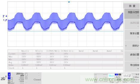 實測100~240VAC輸入開關(guān)電源初次級最大電壓波形如下圖3所示,工作電壓峰值為500V,工作電壓有效值為265V,根據(jù)表2J可知交流電網(wǎng)電源瞬態(tài)電壓為2500V。