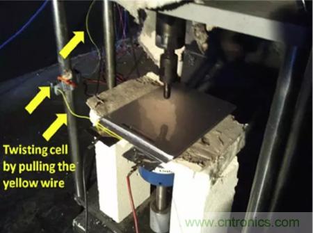 目前能夠模擬鋰離子電池內(nèi)短路的方式有多種,例如針刺測試,小壓痕測試,BAJ測試和機(jī)械擠壓測試等,通過對(duì)大尺寸方形電池特點(diǎn)的分析,Hsin Wang認(rèn)為機(jī)械擠壓測試最適合應(yīng)用方形鋰離子電池的測試上。但是在傳統(tǒng)的擠壓的測試中由于電池受到的破壞太大,幾乎所有的電池都會(huì)發(fā)生熱失控,因此傳統(tǒng)的擠壓測試對(duì)不同種類電池安全性的“分辨率”就很低,只有通過和不通過兩種結(jié)果,只能對(duì)鋰離子電池的安全性進(jìn)行定性分析??赡軆蓚€(gè)電池都沒有通過安全性測試,但是A電池的安全性卻要好于B電池,為了能夠準(zhǔn)確的評(píng)估不同體系電池的安全性能,Hsin Wang對(duì)傳統(tǒng)的擠壓實(shí)驗(yàn)進(jìn)行了改進(jìn),通過在電池負(fù)極極耳上施加一個(gè)拉力,讓電池產(chǎn)生大約5°的扭曲,從而減少在擠壓過程中電池受到的破壞,因此該實(shí)驗(yàn)?zāi)軌驕?zhǔn)確的評(píng)估不同種類電池的的安全性高低。