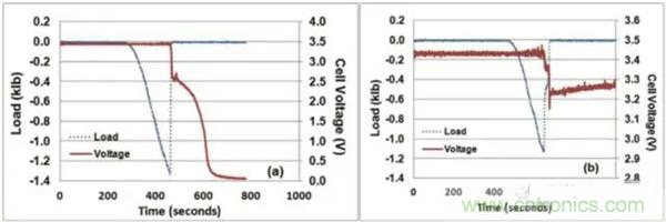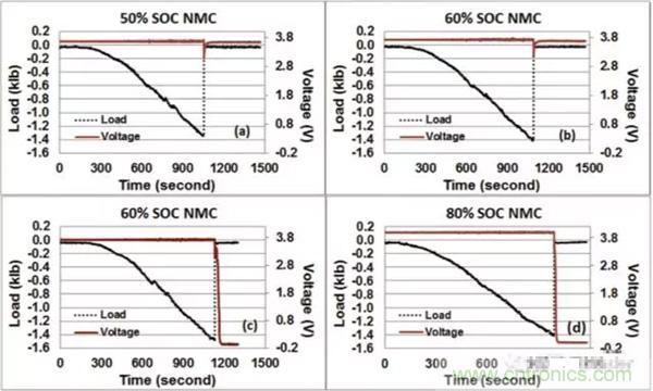在對(duì)25Ah的NMC電池?cái)D壓-扭轉(zhuǎn)測試中,發(fā)現(xiàn)50%SoC狀態(tài)下的電池都成功通過了測試,如圖a所示,60%SoC狀態(tài)下的電池有三只通過了測試,如圖b所示,另外的三只沒有通過測試,如圖c所示,可見60%SoC的電池通過測試和不通過測試的概率各為50%,而80%SoC的電池則都沒有通過測試,如圖d所示。由此可見,60%SoC是NMC電池安全性的一個(gè)分水嶺,低于這個(gè)數(shù)值時(shí)電池相對(duì)是安全的,高于這個(gè)數(shù)值,則電池在機(jī)械濫用的情況下的安全性將大大下降。