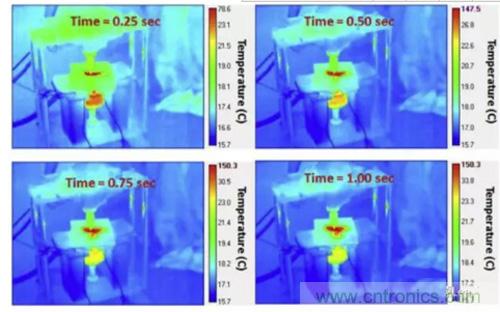下圖為60%SoC的NMC電池在擠壓-扭轉(zhuǎn)實(shí)驗(yàn)中的熱成像圖,從圖中可以看到在短路發(fā)生后,短路點(diǎn)的溫度在0.5S內(nèi)迅速升高到了147.5 ℃,隨后高溫區(qū)域迅速向周圍擴(kuò)展,說明周圍區(qū)域溫度升高并不是由熱傳導(dǎo)導(dǎo)致的,而是高溫引發(fā)了其他的化學(xué)反應(yīng)。而在80%SoC下,NMC電池發(fā)生熱失控的溫度更高,引起周圍化學(xué)反應(yīng)的速度也更快。
