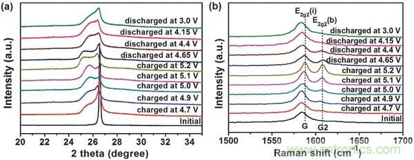 b)1C電流密度下第一次充電-放電循環(huán)過程中記錄的EG正極的非原位拉曼光譜