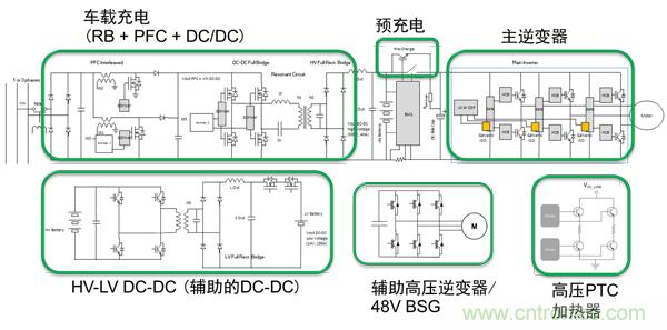 HEV/EV的重點應(yīng)用有:車載充電器、電池管理、牽引逆變器、輔助逆變器、48 V皮帶啟動發(fā)電機(jī)(BSG)和DC-DC轉(zhuǎn)換器。