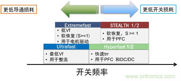 根據(jù)不同的應(yīng)用,整流器可選擇更低導(dǎo)通損耗或更低開關(guān)損耗的產(chǎn)品,各類產(chǎn)品的主要特點及應(yīng)用如圖2所示。
