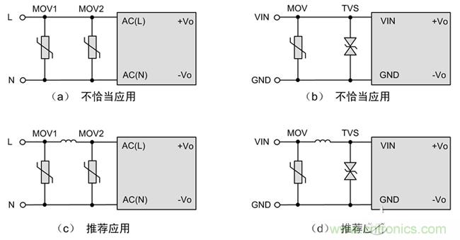 電源模塊體積小,在EMC要求比較高的場合,需要增加額外的浪涌防護(hù)電路,以提升系統(tǒng)EMC性能。如圖1所示,為提高輸入級的浪涌防護(hù)能力,在外圍增加了壓敏電阻和TVS管。但圖中的電路(a)、(b)原目的是想實(shí)現(xiàn)兩級防護(hù),但可能適得其反。如果(a)中MOV2的壓敏電壓和通流能力比MOV1低,在強(qiáng)干擾場合,MOV2可能無法承受浪涌沖擊而提前損壞,導(dǎo)致整個系統(tǒng)癱瘓。同樣的,電路(b),由于TVS響應(yīng)速度比MOV快,往往是MOV未起作用,而TVS過早損壞。