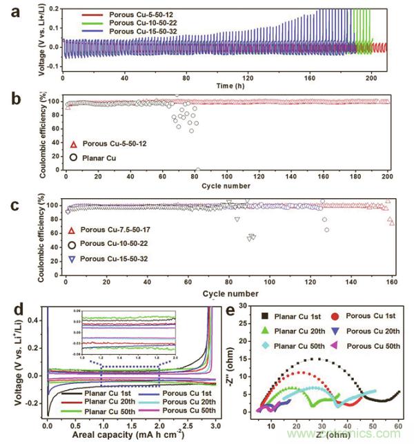 c)鋰沉積在多孔Cu-7.5-50-17、Cu-10-50-22、Cu-15-50-32時(shí)的循環(huán)穩(wěn)定性能及庫倫效率
