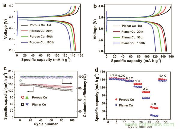 c)平板銅和多孔銅為集流體時(shí),Li / LFP電池的循環(huán)性能比較