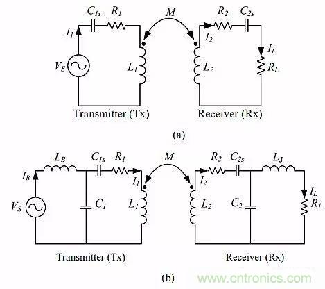 圖1:無(wú)線輸電(WPT)設(shè)計(jì)中所用補(bǔ)償電路拓?fù)溆兴姆N,這里是其中兩種:(a)SS拓?fù)?,(b)LCL-LCL拓?fù)洹?/p>