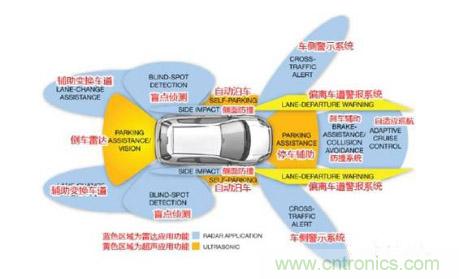 ADAS(高級輔助駕駛系統(tǒng)),是指利用安裝于車上各式各樣的傳感器,在第一時間收集車內(nèi)的環(huán)境數(shù)據(jù),進行靜、動態(tài)物體的辨識、偵測與追蹤等技術(shù)上的處理,從而能夠讓駕駛者在最快的時間察覺可能發(fā)生的危險。通常包括導(dǎo)航與實時交通系統(tǒng)TMC,電子警察系統(tǒng)ISA 、自適應(yīng)巡航ACC 、車道偏移報警系統(tǒng)LDWS、車道保持系統(tǒng),碰撞避免或預(yù)碰撞系統(tǒng)、夜視系統(tǒng)、自適應(yīng)燈光控制、行人保護系統(tǒng)、自動泊車系統(tǒng)、交通標志識別、盲點探測,駕駛員疲勞探測、下坡控制系統(tǒng)和電動汽車報警系統(tǒng)等。