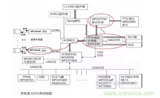 NXP已經(jīng)發(fā)布Blubox平臺,為OEM廠商提供設(shè)計、制造、銷售Level 4級(SAE)無人駕駛汽車的解決方案計算平臺。下圖是NXP的ADAS系統(tǒng)框圖,該系統(tǒng)對多路視頻、77G雷達的數(shù)據(jù)進行融合處理,然后傳送給云端和車身系統(tǒng)。我們看到NXP是能夠提供全套Reference方案的公司,在這一塊的產(chǎn)品線很全,雖然現(xiàn)在沒有做更多的芯片集成,而是提供相對分散的芯片及解決方案。我們這里重點介紹一下中央處理器S32V234和MPC5775K,MPC5775K是對雷達數(shù)據(jù)進行處理,而S32V234是對多傳感器處理過的數(shù)據(jù)進行融合分析,通過CAN總線,把結(jié)果傳給車身系統(tǒng)。