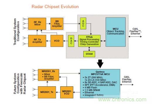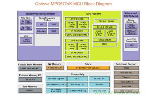 QorivvaMPC567xK系列基于Power Architecture® 的32位MCU,MPC577XK是專門的雷達信息處理芯片,該系列增加了芯片的存儲器,提升了運行速度和性能,能夠支持自適應(yīng)巡航控制、智能大燈控制、車道偏離警告和盲點探測等應(yīng)用。從整個雷達系統(tǒng)來看,結(jié)合77G雷達收發(fā)器芯片組、Qorivva MPC567xK MCU、FPGA, ADC, DAC, SRAM, 支持長、中、短距離應(yīng)用。這里需要重點關(guān)注的是信號處理工具集(Signal Processing Toolbox)設(shè)計,包括了FFT、DMA、COPY、Scheduler。目前77GHz的FCMW型雷達在數(shù)字信號處理中需要使用FFT,即快速傅里葉變換,一般車載雷達的采樣點在512-2048左右,從芯片架構(gòu)圖我們看到專門的FFT電路。