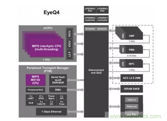 其中特別要指出的是Mobileye的EyeQ系列,已經(jīng)被多家汽車制造商使用,包括奧迪、寶馬、菲亞特、福特、通用、本田、日產(chǎn)、標致、雪鐵龍、雷諾、沃爾沃和特斯拉等在內(nèi)。最近的EyeQ4展示的性能已經(jīng)達到2.5 萬億次每秒的性能,其運行功率可低至3W。從硬件架構(gòu)來看,該芯片包括了一組工作在1GHZ的工業(yè)級四核MIPS處理器,以支持創(chuàng)新性的多線程技術(shù)能更好的進行數(shù)據(jù)的控制和管理。多個專用的向量微碼處理器(VMP),用來應(yīng)對ADAS相關(guān)的圖像處理任務(wù)(如:縮放和預(yù)處理、翹曲、跟蹤、車道標記檢測、道路幾何檢測、濾波和直方圖等)。一顆軍工級MIPS Warrior CPU位于次級傳輸管理中心,用于處理片內(nèi)片外的通用數(shù)據(jù)。