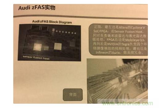 由于目前融合多是雷達與攝像頭融合,所需要的帶寬,一般的ASIC都能夠滿足。但是要融合激光雷達,則最好用FPGA,F(xiàn)PGA做傳感器Hub是最合適不過的。同時傳感器融合目前應(yīng)用較少,合適的ASIC并不好找,F(xiàn)PGA成為主流選擇。同時,對一些精度要求較高的雷達,如使用單精度浮點處理實現(xiàn)一個4096點FFT,采樣點越多,誤差就越小,但運算量會大幅度增加。它在每個時鐘周期輸入輸出四個復(fù)數(shù)采樣。每個FFT內(nèi)核運行速度超過80 GFLOP,這一般需要FPGA才能比較好的實現(xiàn)。一般車載雷達的采樣點在512-2048左右,但軍用的可以達到8192,必須配備FPGA。如下圖在AudizFAS的實物中,采用了Altera的CycloneV SoCFPGA,作為sensor fusion,同時負責(zé)毫米波雷達與激光雷達數(shù)據(jù)處理。