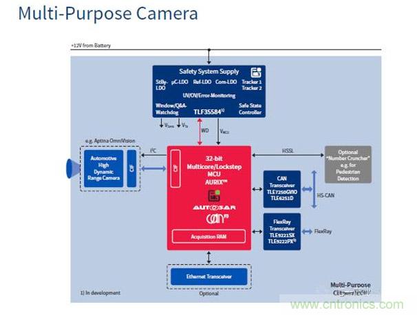 Visiconti采用多核異構(gòu)的專用處理器,Visconti2可實時處理,并行實現(xiàn)4項功能,如車道保持、前車檢測、行人辨識、交通標志辨識。Visconti4圖像識別處理器可輕松對車輛和行人加以辨識,對交通信號、障礙物、行車線等信息加以識別,從而實現(xiàn)各種高級的駕駛員輔助應(yīng)用,如入車道偏離警告、前方/后方防撞警告、前方/后方行人防撞警告、交通標識識別等,能同時處理并實現(xiàn)8項功能。