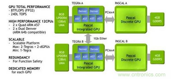 NVIDIA推出的Drive PX2被黃仁勛稱為“為汽車設(shè)計的超級電腦”,它將成為汽車的標準配備,可以用來感知汽車所處位置、辨識汽車周遭的物體,并且即時計算最安全的路徑。“Tegra X1處理器和10GB內(nèi)存,能夠同時處理12個200萬像素攝像頭每秒60幀的拍攝圖像,并通過環(huán)境視覺計算技術(shù)和強大的深層神經(jīng)網(wǎng)絡(luò),主動識別道路上的各種車輛,甚至還能檢測前方車輛是否在開門。Driver PX2還搭載了其他合作伙伴的芯片,包括Avago的PEX8724(24-lane,6-port,第三代 PCIe Gen交換機)用于兩塊Parker之間的互聯(lián)。還有一片英特爾收購的Altera提供的FPGA,用于執(zhí)行實時操作系統(tǒng)。FPGA的型號為Cyclone V 5SCXC6,是Altera的頂級產(chǎn)品,邏輯運算為110K,注冊器達166036。最后還有一款英飛凌的AURIX TC 297 MCU做安全控制,據(jù)說可以讓PX2達到ASIL C級水平。 還有博通的BCM89811低功耗物理層收發(fā)器(PHY),使用BroadR-Reach車載以太網(wǎng)技術(shù),在單對非屏蔽雙絞線上的傳輸速率可達100Mbps。所以NVidia實際上推出了板級的ADAS系統(tǒng)。