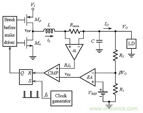 控制器如何調(diào)整D?控制器有兩類:電壓模式和電流模式控制器。下面將討論電流模式控制器下面的一個(gè)常見類型——峰值電流模式控制(PCMC),圖3是它的一個(gè)示例。為感測電感電流iL,電路使用一個(gè)小串聯(lián)電阻Rsense,其壓降由具有ai增益的放大器放大。該放大器將iL轉(zhuǎn)換成電壓RiiL,其中:
