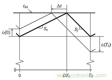 這樣,我們僅以電流形式就可以顯示一個(gè)周期,如圖4所示?,F(xiàn)在,復(fù)位觸發(fā)器打開Mp開關(guān),同時(shí)關(guān)閉Mn開關(guān),使vSW= 0。在表示為(1–D)TS的周期其余部分,我們有vL=0–VO,所以iL以Sf的斜率下降,因此有: