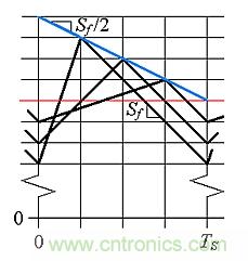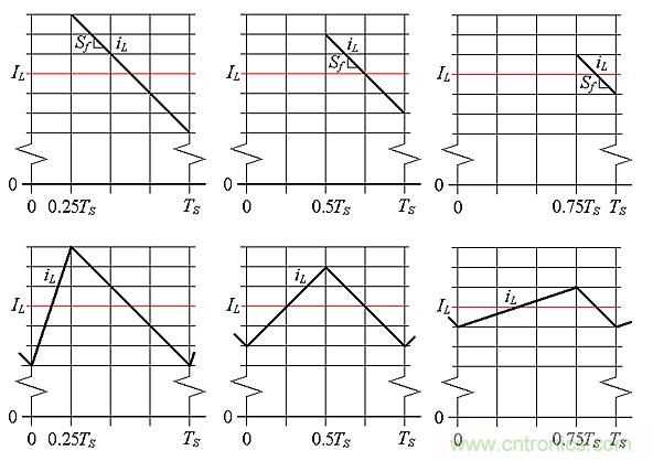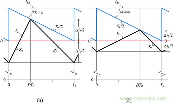 回來看圖5,我們觀察到,如果希望圖5b保持與圖5a相同的iL值,需要減小圖5b的iEA值,以便“下壓”iL波形,直到各IL對(duì)齊。那么, iEA需要減到多少呢?為了回答這個(gè)問題,需要畫出三個(gè)不同D值所需的iL波形。如圖7所示,我們從頂部繪制iL的下降斜坡開始,以相同的IL為垂直中心,并且全具有相同的斜率Sf=-VO/L。接下來,通過繪制上行斜坡來完成iL波形,如圖7底部所示。最后,將這三張圖疊加,如圖8所示,并觀察到峰值軌跡斜坡的斜率為Sf/2 = –VO/2L。
