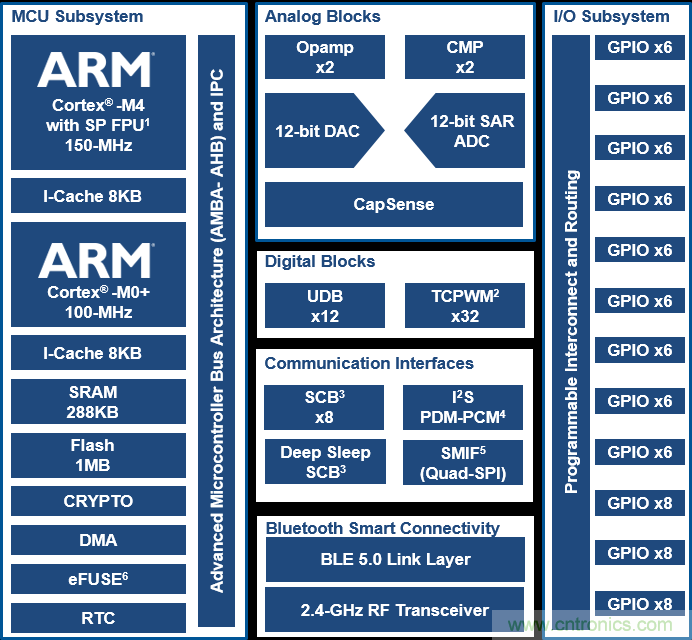 擴充處理器容量、內(nèi)存及功耗方面的性能不會憑空而來。對于許多應(yīng)用程序而言,底層硬件(例如MCU)需要做出相應(yīng)調(diào)整以適應(yīng)這些特性。因此,生產(chǎn)商在設(shè)計下一代MCU時必須時刻緊記這些要求。例如,賽普拉斯 PSoC 6 BLE MCU(見圖1)為物聯(lián)網(wǎng)設(shè)計人員提供BLE 5.0所具備的這些功能。
