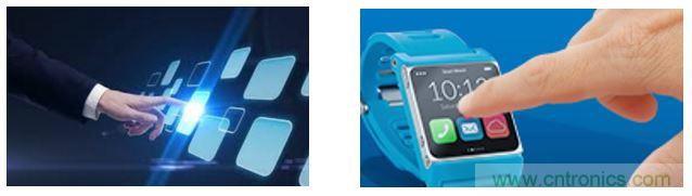 電容式觸摸顯示屏 ─觸摸顯示屏為中型及大型的物聯(lián)網(wǎng)設(shè)備提供豐富的用戶界面。從微波爐到手持式醫(yī)療設(shè)備,從智能手表到工業(yè)控制器等等。通常,使用電容觸摸技術(shù)結(jié)合顯示屏上透明的銦錫氧化物層(ITO)來實現(xiàn)觸摸顯示屏。依據(jù)這種應(yīng)用方式,電容式觸控技術(shù)要求能夠在潮濕的環(huán)境下工作。