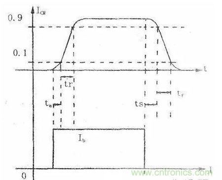 前面已提到,此段曲線不可能是垂直線,因而形成上升時間tr。很明顯,三極管的hfe越大,Tr越短。經(jīng)過延遲時間與上升時間之后,三極管Ic=90%的Icm才認(rèn)為其已經(jīng)導(dǎo)通,開關(guān)閉合,因此導(dǎo)通時間為ta+tr。當(dāng)驅(qū)動脈沖回落至零時,開關(guān)的關(guān)斷同樣需要一定的時間。