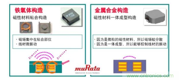 對(duì)于金屬合金構(gòu)造的電感來說,因?yàn)樾纬删€圈的磁性材料是微粒的,所以磁場(chǎng)較分散;一體成型構(gòu)造也能夠控制線材的振動(dòng),從而很難產(chǎn)生嘯叫問題。