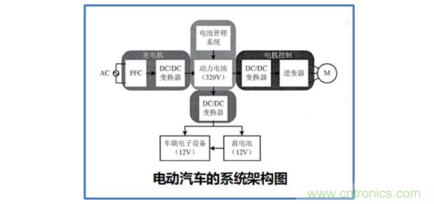 另一方面,DC/DC變換器可以將電動(dòng)機(jī)制動(dòng)剎車時(shí)由機(jī)械能轉(zhuǎn)化而來的電能回饋給蓄電池組,其效率高達(dá)85%~95%,遠(yuǎn)大于發(fā)電機(jī)的正常效率。以可控的方式給蓄電池組充電,尤其是在電動(dòng)汽車需要頻繁啟動(dòng)和制動(dòng)的城市工況運(yùn)行條件下,可以有效地回收制動(dòng)能量,增加電動(dòng)汽車的行駛里程。因此,電動(dòng)汽車采用DC/DC變換器可以優(yōu)化電動(dòng)機(jī)控制、提高電動(dòng)汽車的整體效率和性能。下圖為電動(dòng)汽車的系統(tǒng)架構(gòu)圖。