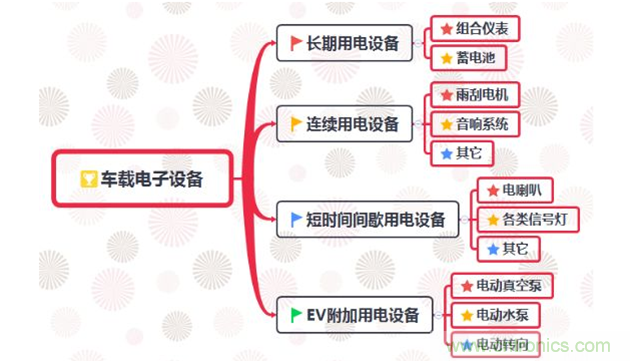 作為電動(dòng)汽車的供電設(shè)備,DC/DC變換器也給車載電子設(shè)備供電。根據(jù)純電動(dòng)汽車車載電子設(shè)備不同屬性,可把用電設(shè)備分為長(zhǎng)期用電設(shè)備、連續(xù)用電設(shè)備、短時(shí)間間歇用電設(shè)備和EV附加用電設(shè)備等四種類型,如下圖所示。同時(shí),DC/DC變換器的體積和種類都很小且輸出穩(wěn)定。