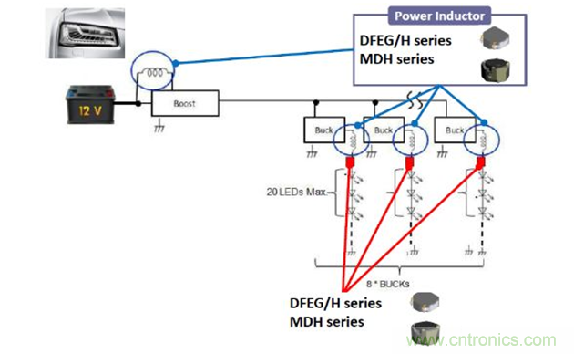在汽車應(yīng)用中,目前車燈廣泛采用LED光源,因此會(huì)用到Boost DC/DC和Buck DC/DC等轉(zhuǎn)換器。