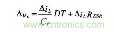 輸出濾波電容的選擇應(yīng)考慮工作頻率、輸出電流紋波、輸出電壓紋波和能量?jī)?chǔ)存能力。電解電容的等效串聯(lián)電阻(ESR)會(huì)隨開關(guān)工作頻率的變化而變化。輸出電壓的紋波由以下公式給出: