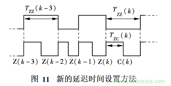 為使換相點(diǎn)位于相鄰2個(gè)過零點(diǎn)的中間位置,本文提出一種新的延遲時(shí)間設(shè)置方法. 如圖11所示,過零點(diǎn)的間隔時(shí)間TZZ ( k - 3)和TZZ ( k)相等,當(dāng)檢測(cè)到第k次過零點(diǎn)時(shí),從第k次過零點(diǎn)到第k次換相點(diǎn)的延遲時(shí)間tZC ( k)如下設(shè)置: