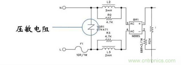■大功率設(shè)備斷開或接入電網(wǎng)時(shí),會使得電網(wǎng)電壓上升或跌落。為了保 護(hù)電源,有時(shí)會使用一個(gè)壓敏電阻接在輸入端。