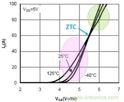 功率MOSFET的轉(zhuǎn)移特性如圖1所示,VGS與電流ID曲線有一個(gè)溫度系數(shù)為0的電壓值5.5V,通常這個(gè)點(diǎn)就稱為零溫度系數(shù)點(diǎn)ZTC(Zero Temperature Coefficient)。VGS高于5.5V時(shí),溫度越高電流越小,功率MOSFET的RDS是正溫度系數(shù);VGS低于5.5V時(shí),溫度越高電流越大,功率MOSFET的的RDS是負(fù)溫度系數(shù)。