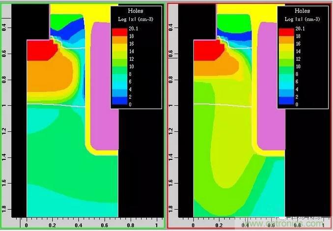 圖5:完全導(dǎo)通(左)和線性區(qū)的空穴分布圖
